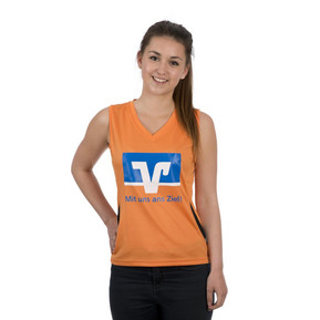Ärmellose Laufshirts für Herren und Damen - bedruckt für die Volksbank Flein-Talheim. Diese knalligen Lauf Tank Tops trocknen super schnell.